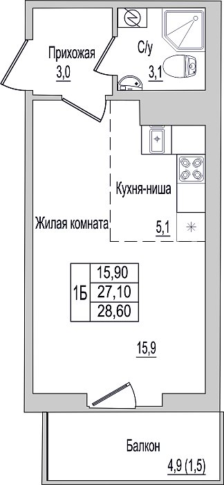 1-комнатная квартира, этаж 7, площадь 28,6 м²