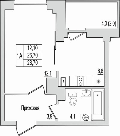 1-комнатная квартира, этаж 6, площадь 28,7 м²