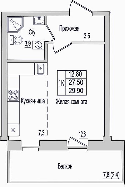 1-комнатная квартира, этаж 2, площадь 29,9 м²