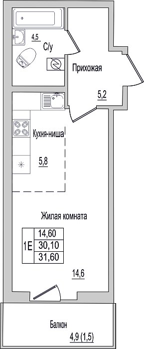 1-к. квартира, 31.6 м², 1/10 эт.