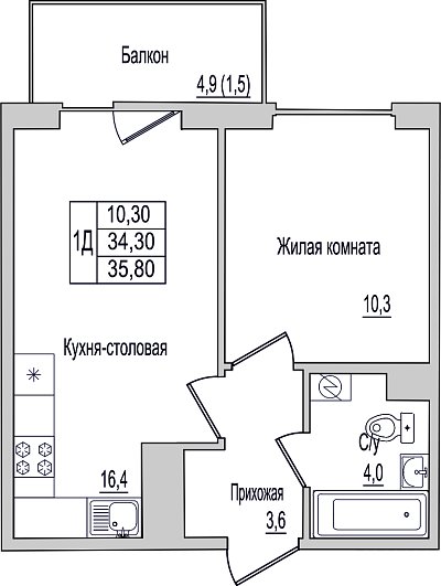 1-комнатная квартира, этаж 8, площадь 35,8 м²