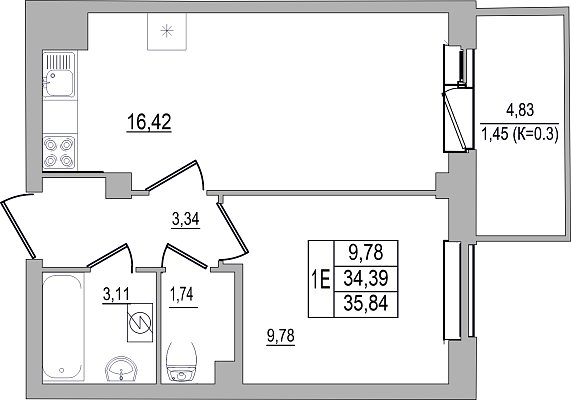 1-комнатная квартира, этаж 7, площадь 35,84 м²