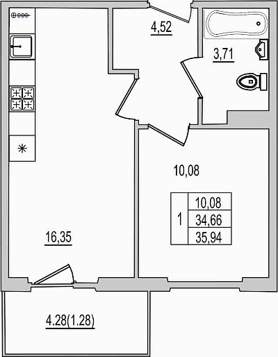 1-комнатная квартира, этаж 10, площадь 35,94 м²