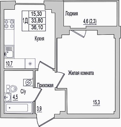 1-комнатная квартира, этаж 2, площадь 36,1 м²