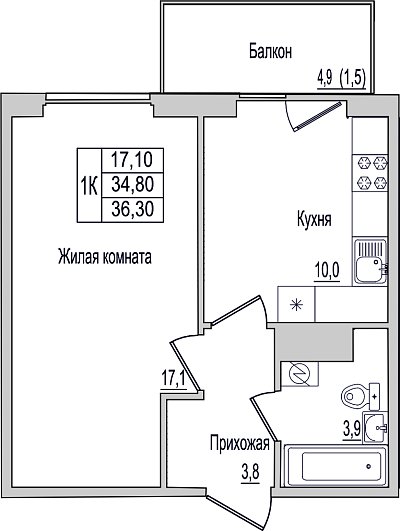 1-комнатная квартира, этаж 7, площадь 36,3 м²