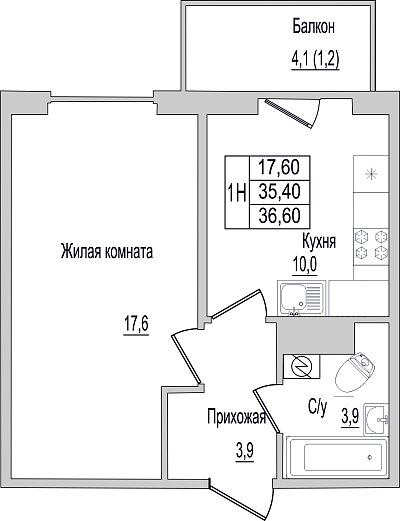 1-комнатная квартира, этаж 2, площадь 36,6 м²