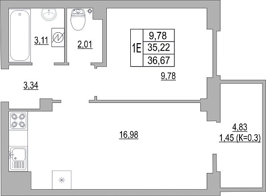 1-комнатная квартира, этаж 1, площадь 36,67 м²