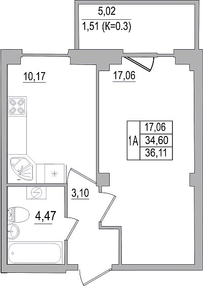 1-комнатная квартира, этаж 1, площадь 36,67 м²