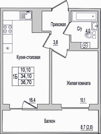 Квартира, этаж 5, площадь 36.7м²