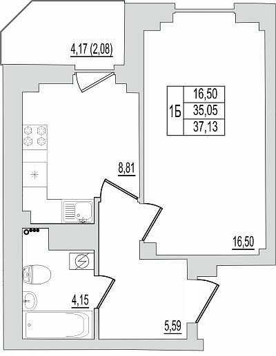 1-комнатная квартира, этаж 3, площадь 37,13 м²