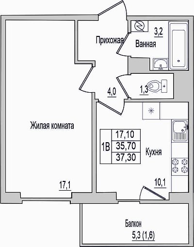 1-комнатная квартира, этаж 3, площадь 37,3 м²