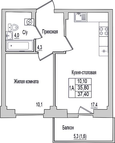 Квартира, этаж 2, площадь 37.4м²