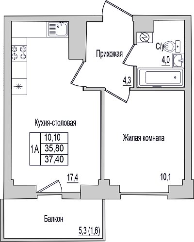Квартира, этаж 5, площадь 37.4м²