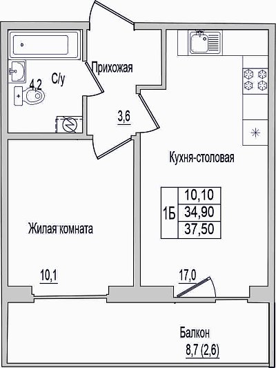 1-комнатная квартира, этаж 1, площадь 37,5 м²