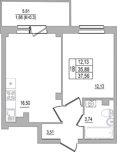 1-комнатная квартира, этаж 9, площадь 37,56 м²