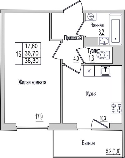 Квартира, этаж 6, площадь 38.3м²