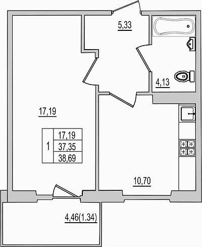 1-комнатная квартира, этаж 6, площадь 38,69 м²