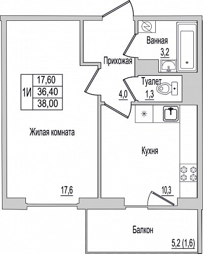 1-комнатная квартира, этаж 9, площадь 38 м²