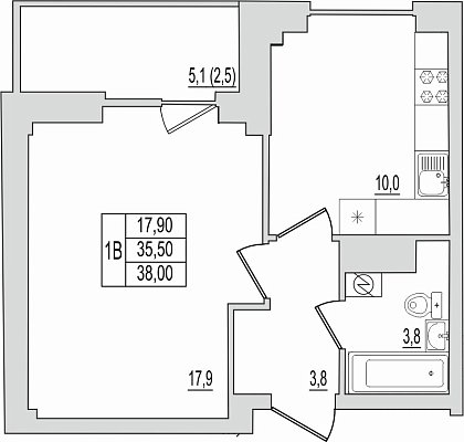 1-комнатная квартира, этаж 9, площадь 38 м²
