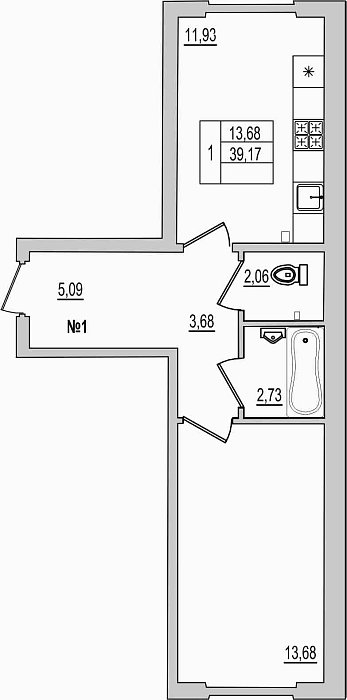 1-комнатная квартира, этаж 1, площадь 39,17 м²