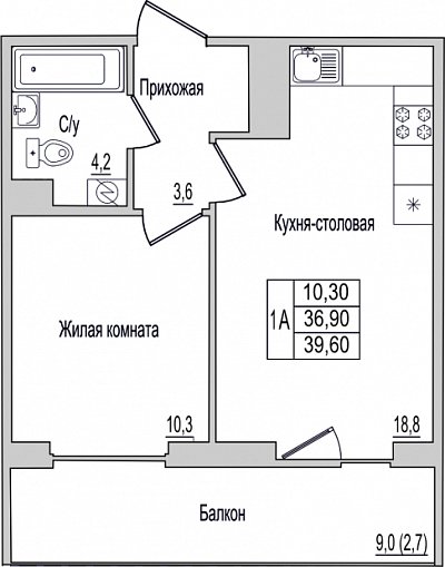 1-комнатная квартира, этаж 1, площадь 39,6 м²