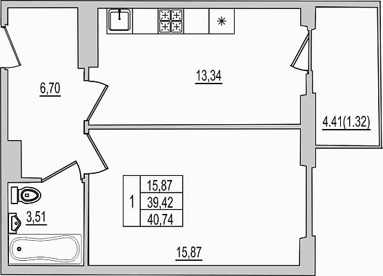 1-комнатная квартира, этаж 4, площадь 40,74 м²