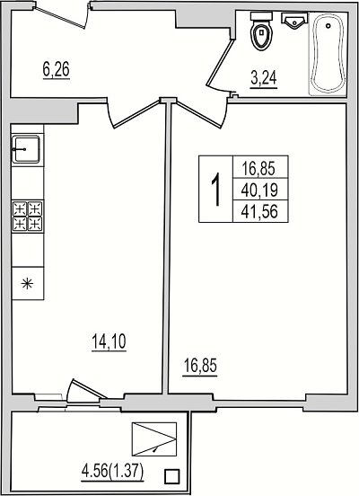 1-комнатная квартира, этаж 6, площадь 41,56 м²
