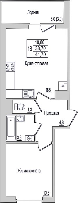 1-комнатная квартира, этаж 7, площадь 41,7 м²