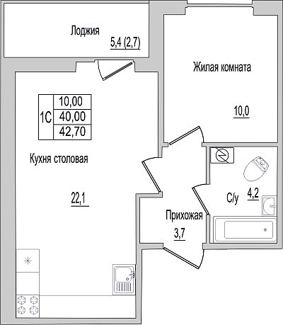 1-к. квартира, 42.7 м², 1/10 эт.