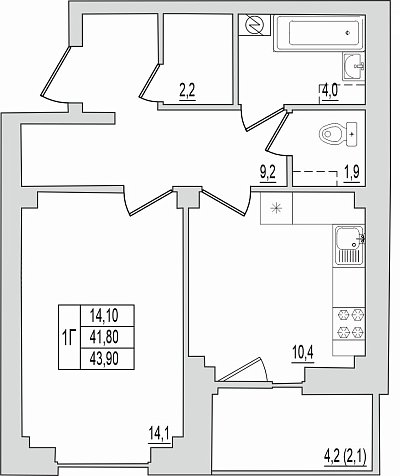 1-комнатная квартира, этаж 1, площадь 43,9 м²
