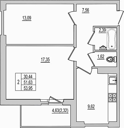 1-комнатная квартира, этаж 6, площадь 53,97 м²