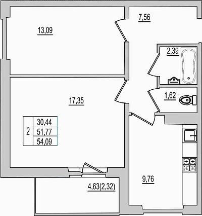 1-комнатная квартира, этаж 3, площадь 54,09 м²