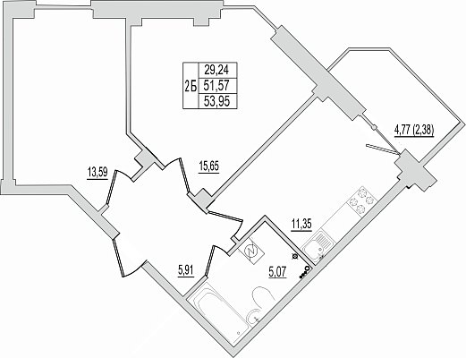 Квартира, этаж 1, площадь 53.95м²