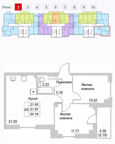 2-комнатная квартира, этаж 2, площадь 54,39 м²