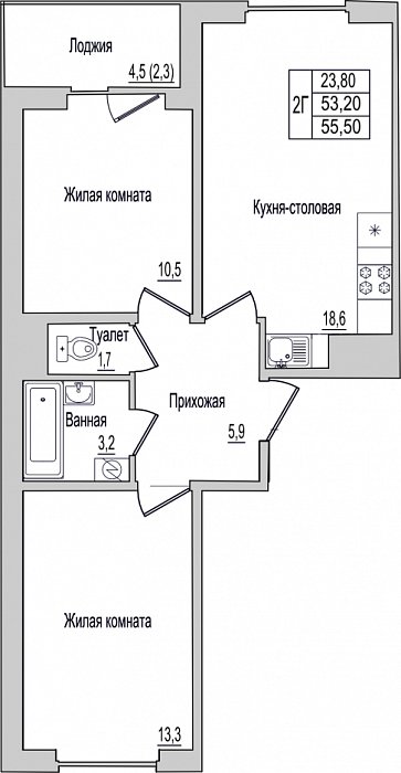 2-комнатная квартира, этаж 1, площадь 55,5 м²
