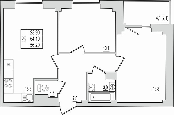 2-комнатная квартира, этаж 10, площадь 56,2 м²