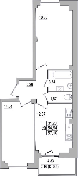 2-комнатная квартира, этаж 6, площадь 57,1 м²