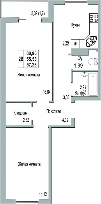2-к. квартира, 57.23 м², 7/9 эт.