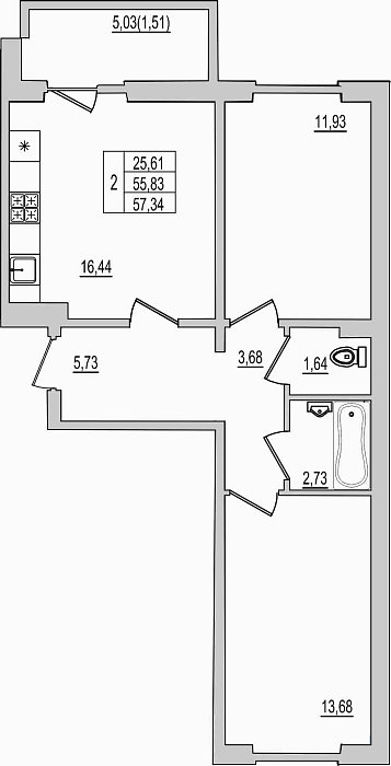 2-комнатная квартира, этаж 10, площадь 57,34 м²