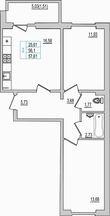 2-комнатная квартира, этаж 3, площадь 57,61 м²