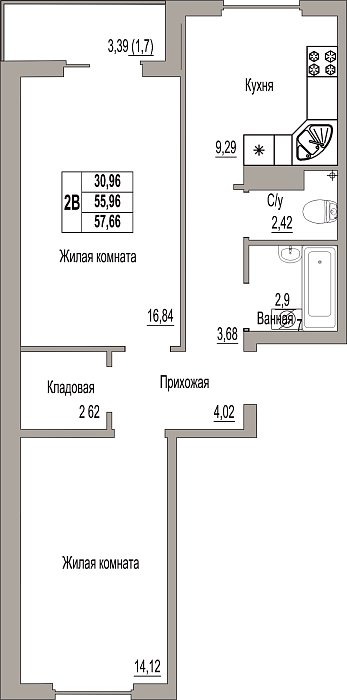 2-к. квартира, 57.8 м², 1/9 эт.