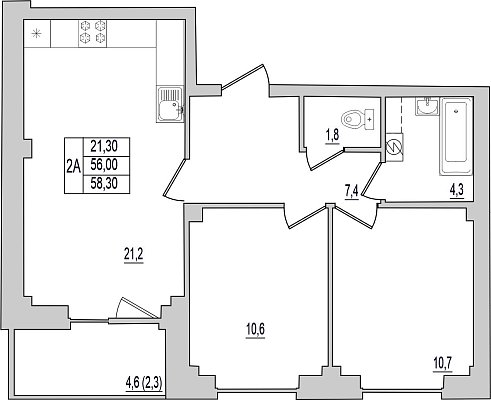 2-комнатная квартира, этаж 1, площадь 58,3 м²