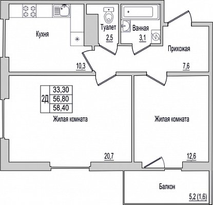 2-комнатная квартира, этаж 1, площадь 58,4 м²
