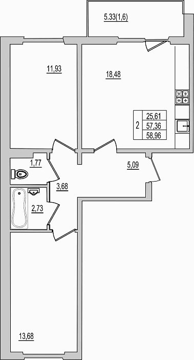 2-комнатная квартира, этаж 2, площадь 58,96 м²