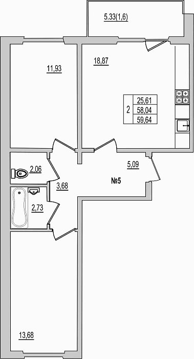 2-комнатная квартира, этаж 1, площадь 59,64 м²