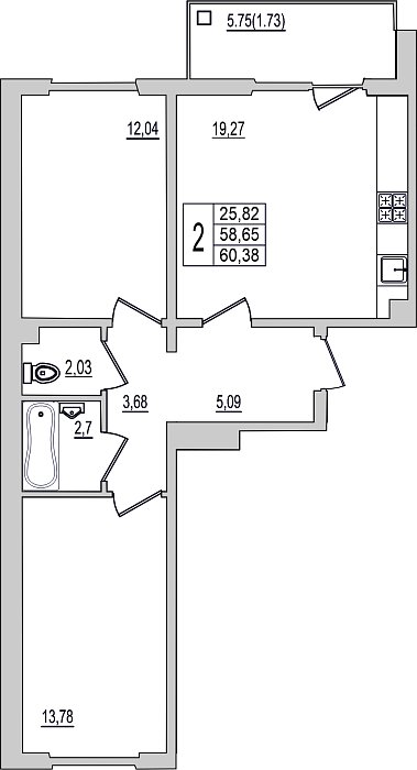 2-комнатная квартира, этаж 1, площадь 60,38 м²