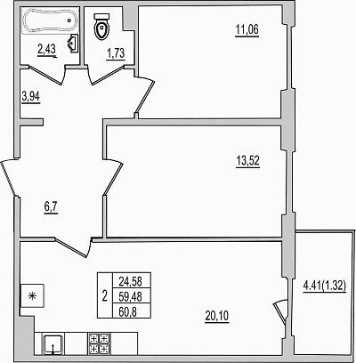 2-комнатная квартира, этаж 5, площадь 60,8 м²