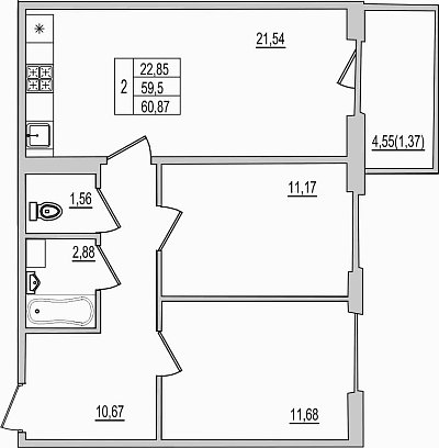 2-комнатная квартира, этаж 10, площадь 60,87 м²