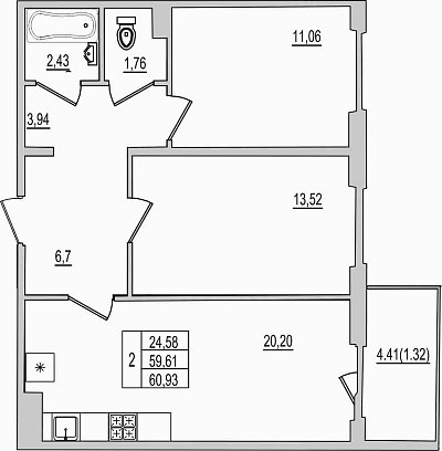 2-комнатная квартира, этаж 2, площадь 60,93 м²