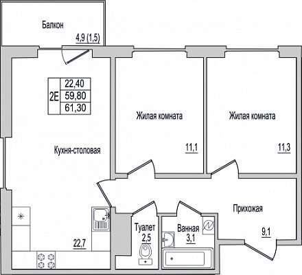 Квартира, этаж 1, площадь 61.3м²